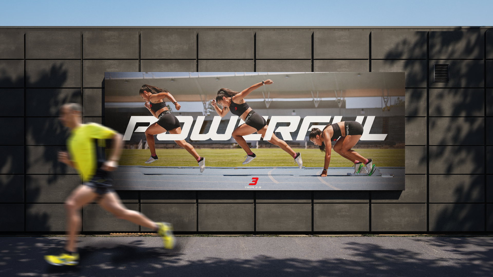t-shirt to a full billboard. I developed a typographic-led system using bold, condensed lettering and a motivational messaging framework where every product carries a word that pushes the wearer forward.