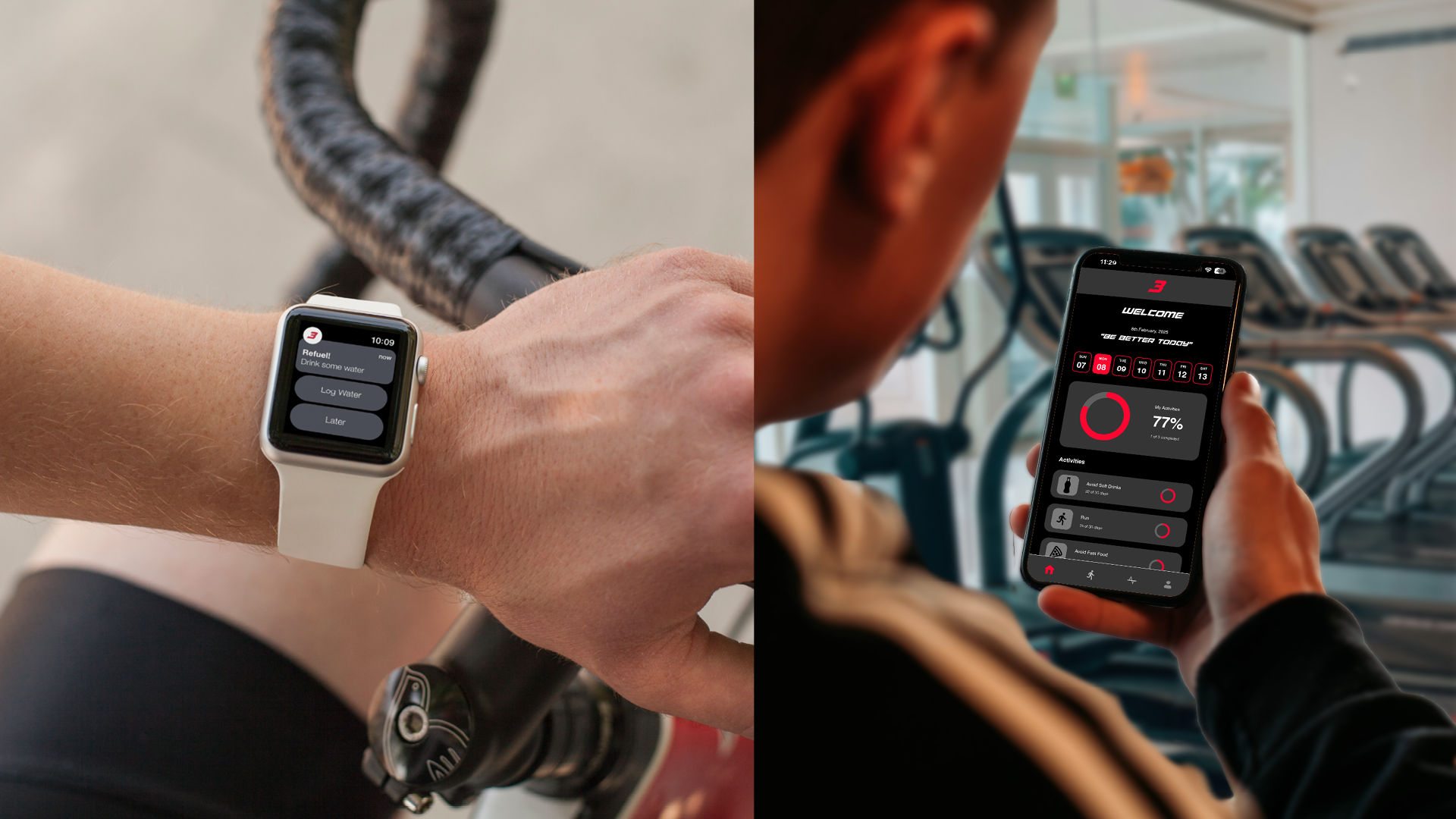 To extend the brand into the digital space, I designed a companion fitness app complete with activity tracking, hydration reminders, and a dashboard that carries the Triple B visual identity into everyday use.